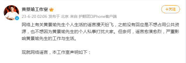 黄景瑜深夜发文!首度回应与前妻关系 极目新闻 内地男星 2023-06-20 17:18:23 305 创作不易,用心坚持,欢迎请BaGua喝几杯爱心咖啡!打赏并支持本文 打赏并删除本文 6月20日凌晨,黄景瑜工作室发声明回应称,黄景瑜与王雨馨是和平分开,期间也不存在网传“劈腿”“出轨”“家暴”等行为,并正告相关主体即刻删撤相关不实言论,望各位网友理智地面对网络信息。声明全文网络上有关黄景瑜先生个人生活的谣言漫天纷飞,之前没有回应是不想占用公共资源,也不想因为黄景瑜先生的个人私事打扰大家。但奈何,谣言愈演愈烈,严重影响黄景瑜先生的工作与生活。现就网络谣言,本工作室声明如下:一、黄景瑜先生与王雨馨女士系和平分开,期间也不存在网传“劈腿”“出轨”“家暴”等行为。未来,仍会以朋友身份相处,也请大家不要再就此事打扰王雨馨女士。二、正告相关主体即刻删撤相关不实言论,并停止传播涉嫌侵权内容。否则,本工作室以及黄景瑜先生将进一步追究未停止侵权行为的主体之法律责任。三、望各位网友理智地面对网络信息,切勿被具有营销性质的账号误导而传播明显失实言论。实施任何行为时均应尊重他人合法权益,遵守法律法规。最后,感谢大家对黄景瑜先生的支持与关注,后续将不再对黄景瑜先生及王雨馨女士之间的任何进行回应,请大家继续多多关注黄景瑜先生的作品。随后,黄景瑜也发文并@王雨馨:“亲人也是朋友,祝未来一切都好。”王雨馨发文:“我的家人及助理从未发声声讨过景瑜任何,我们依旧是朋友更胜似家人,也始终保持着和平分开、好聚好散的相处方式,请大家停止传播不实内容。”图源:视觉中国黄景瑜,1992年出生于辽宁省丹东市,中国内地影视男演员、模特。2016年,因主演网络剧《上瘾》而步入演艺圈,后出演了《红海行动》《结爱·千岁大人的初恋》《飞驰人生》《破冰行动》等多部影视剧。来源:上游新闻编辑:陈曦紫 黄琳审核:魏曦 创作不易,用心坚持,欢迎请BaGua喝几杯爱心咖啡!打赏并支持本文 打赏并删除本文 感谢您的支持鼓励,我会继续努力的!文章地址:用户邮箱:打赏金额:USDT 请输入数字点击”去打赏“,即可进行打赏支持本文章哦 黄景瑜 发表评论