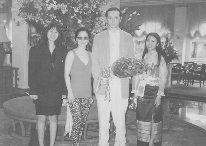 ▲ 41岁的邓丽君和法籍男友在皇家美萍酒店大厅与服务员合影