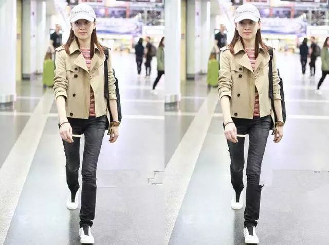 董洁,选择了一条短款的风衣,恰到好处的下摆长度,与牛仔裤的搭配,很好的秀出了胯部和腰身的线条,简约却很有时尚感。整齐的裁剪版型,干净利落十分的大气。