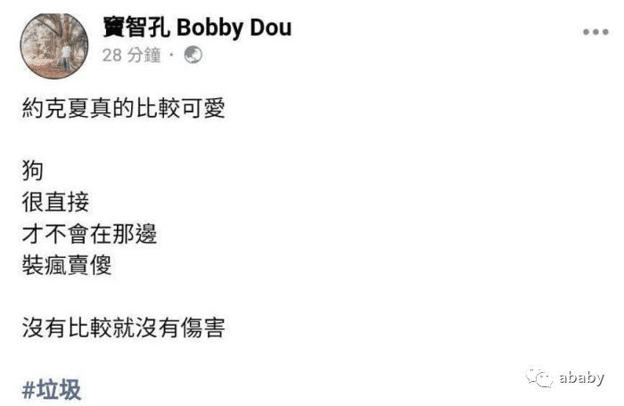 黄嘉千一边希望外界不要过度报道,但一边又到法院起诉离婚,显然这场婚变很难做到和平分手。黄嘉千的好友、演员窦智孔更是发文怒怼夏克立是垃圾,更暗示夏克立不如狗“狗很直接,才不会在那边装疯卖傻,没有比较就没有伤害。”