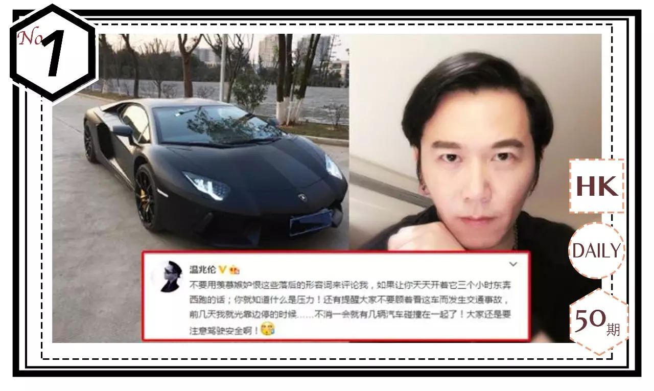 昨日他在微博晒兰博基尼,留言道:「不要用羡慕嫉妒恨这些落后的形容词来评论我,如果让你天天开着它三个小时东奔西跑的话;你就知道什么是压力!还有提醒大家不要顾着看这车而发生交通事故,前几天我就光靠边停的时候……不消一会就有几辆汽车碰撞在一起了!大家还是要注意驾驶安全啊!」