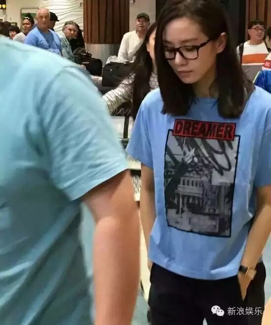 刘诗诗着蓝色T恤带大框眼镜,然而,这么一看,和笔笔还真是有那么几分相似啊~~