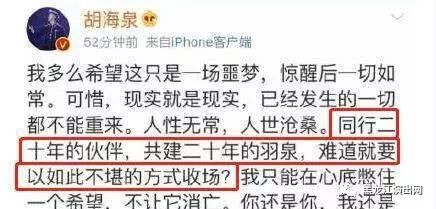在之前胡海泉也被曝出参加各种的商演,在此之中胡海泉都是一人独唱,人们早已习惯了“羽泉”两人的唱风,突然只剩下胡海泉一人演唱,总是感觉不对味,胡海泉在参加某公司年会之时演唱的《奔跑》也很是尴尬,始终都没把场子热起来,想必胡海泉也很无奈吧,但不管怎样的结果,大家都看到了他在努力。