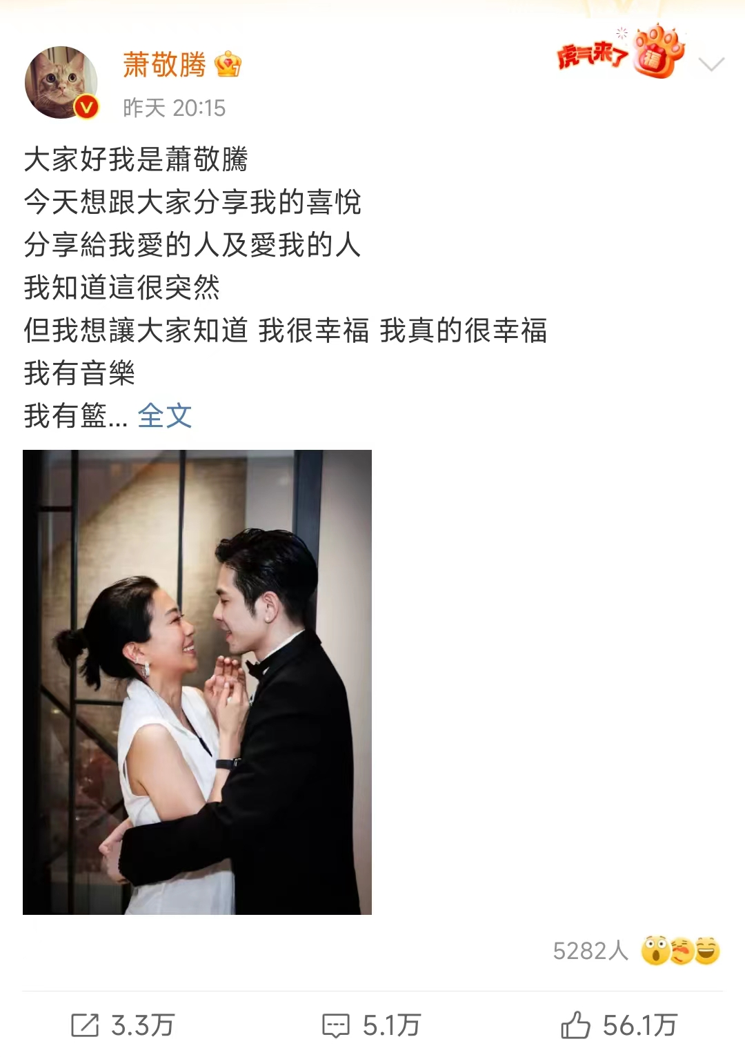 消息一出,网友瞬间炸锅,原来萧敬腾出道那一年,两人就在一起了。不少网友直呼又一个男明星被经纪人“收割”走了,据不完全统计,和自己经纪人结婚的男明星有黎明、张震、大张伟、古巨基、伍佰等,有网友调侃道,“成为嫂子的第一步:变成他的经纪人”。