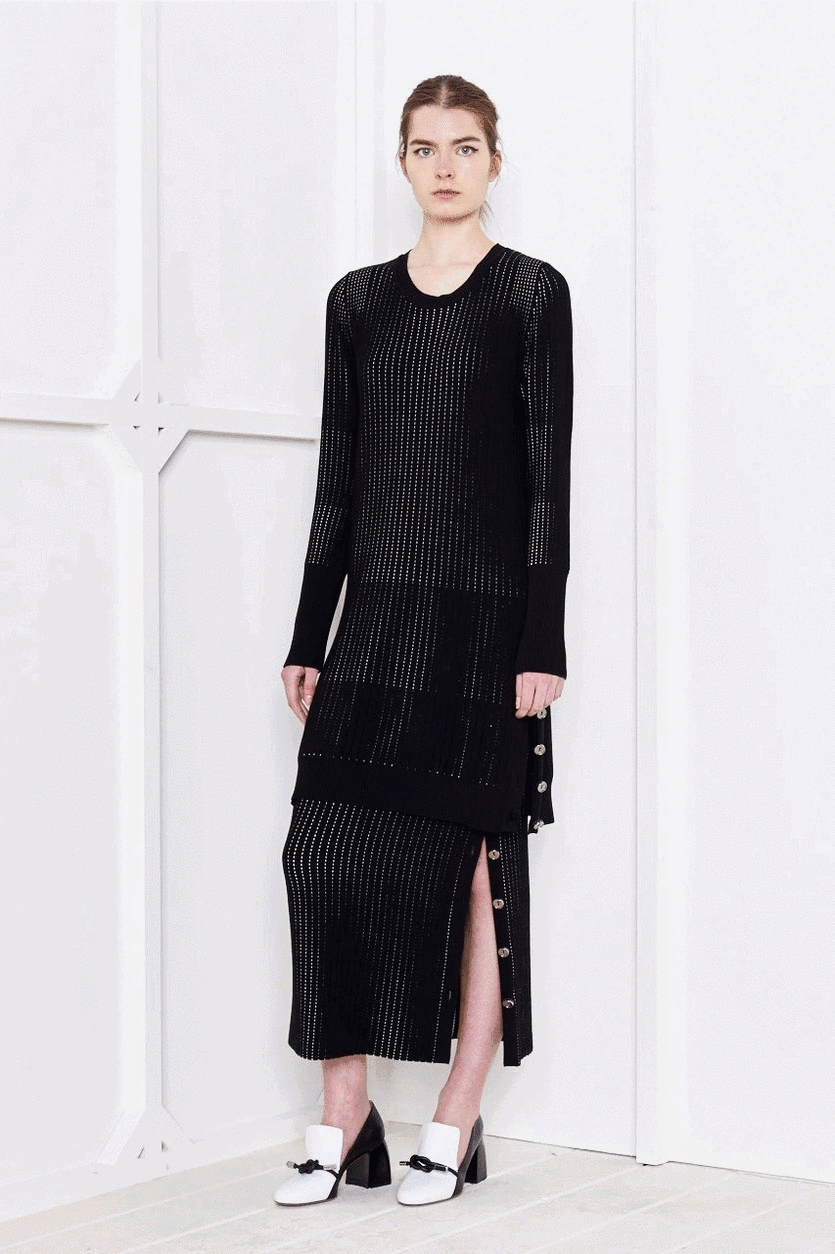 除了上衣及半身裙外,此系列更有推出长针织上衣的款式,可搭配裤款或针织中长裙,穿出整体针织的时尚造型。