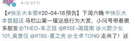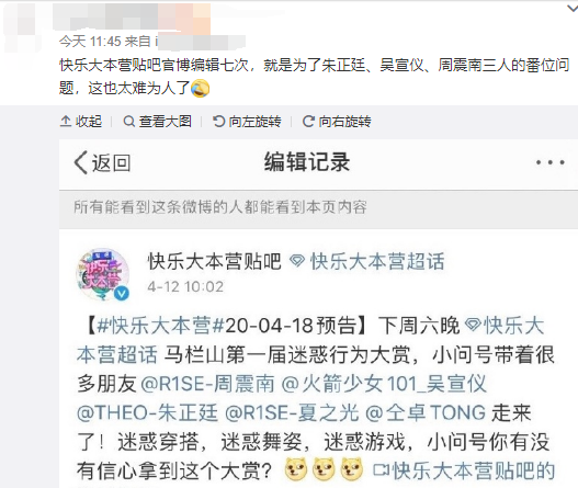 最近,快乐大本营贴吧官博为了调整周震南、吴宣仪、朱正廷三人的番位,编辑微博7次,三人被吐槽番位癌,引起热议。