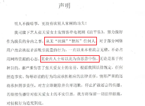 但开播以来作为女主的她讨论数寥寥,团队想主动找话题增加热度又不想败坏口碑,于是逮住路人缘一般的张天爱开撕,而张天爱那边发声明也是想借此否认之前所有拉踩行为,都是套路罢了。