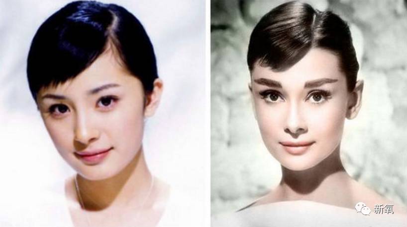 对比一下大幂幂这张照片里,正面的轮廓线,和赫本的区别基本就是,略微凹陷的脸颊,以及下巴那块儿。赫本的轮廓线流畅,太阳穴饱满、两颊利落没有多余赘肉、下巴与脸型衔接自然。