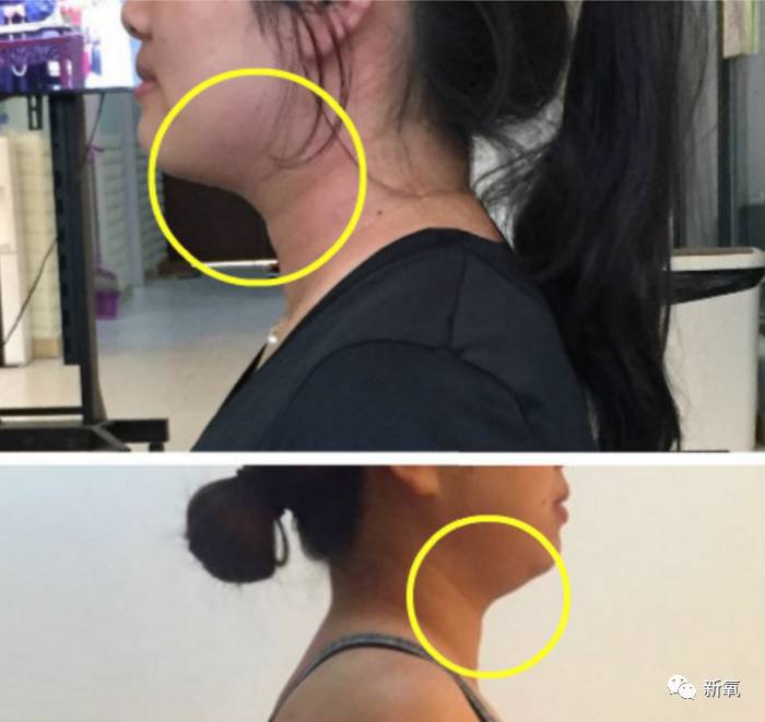 注意图上的红色箭头,左边林依晨的下巴脂肪垫起点在很靠近下巴的地方,而右边下巴和脖子不呈现连着状态,下巴脂肪垫起点在很靠近喉咙的地方。
