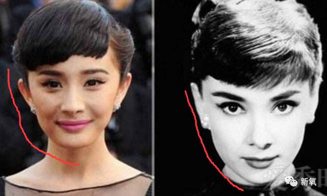 最主要的是侧面的下颌线,赫本的下颌线特别硬,而杨幂的下颌线是弯月牙形状。