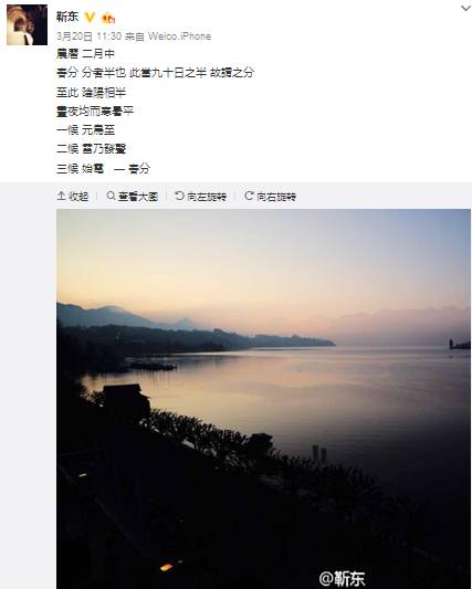 4月19日23:29谷雨节气至,今天节气大使靳东准时上线啦!据说我们靳东已经活成了一本中国最帅日历,可怜的靳属丝们基本上只能在节气当天看到他更博。于是一年中平白无故多了二十四个节日,打着这行字的小编内心真是......你懂的。