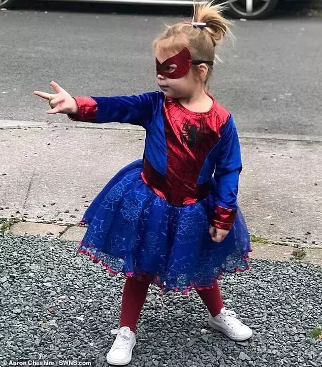 学校老师在知道这件事后,就圆了小女孩的英雄梦,让她当了一回蜘蛛侠。演出时,她还对另一个小孩子说:「你应该像蜘蛛侠一样勇敢。」