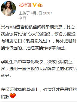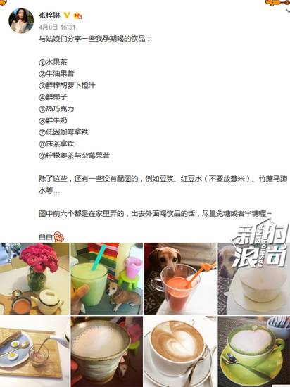 同样孕期好身材的张梓琳,不仅在微博上分享给大家她的饮品清单与饮食小建议,而且还有春日散步照片。