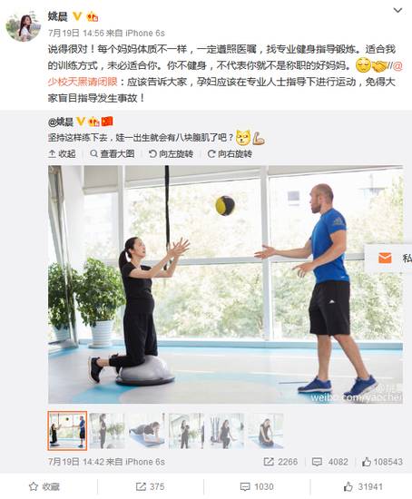 姚晨孕妇健身的教练Victor Rowse说:“对于大多数女性来说,孕期运动不仅安全,更能带来巨大的好处,比如:更加顺利地进行分娩以及更迅速地恢复。”