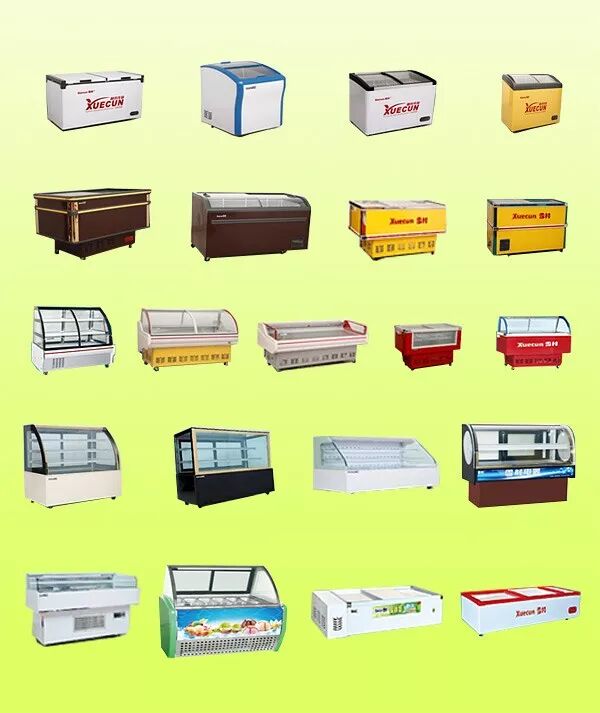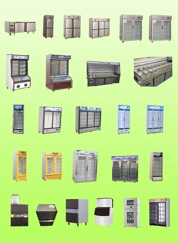 直立陈列柜,卧式雪糕柜,海鲜柜,岛柜,鲜肉柜,蛋糕柜,立风柜,冰激凌柜,药品冷藏柜,点菜柜,厨房四门冰箱,工作台,制冰机等,和碗碟消毒柜。