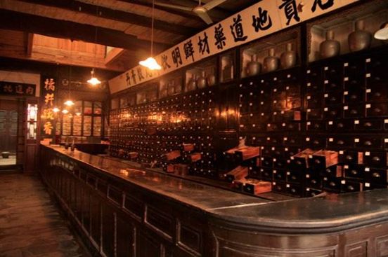 左侧是药房,一整面墙都是密密麻麻的小抽屉,两个小学徒爬上爬下取药,一个药师在柜台拿着小秤熟练地配药。
