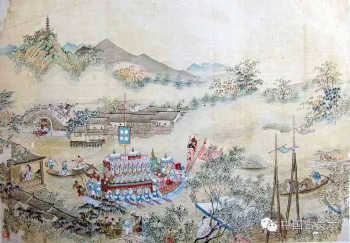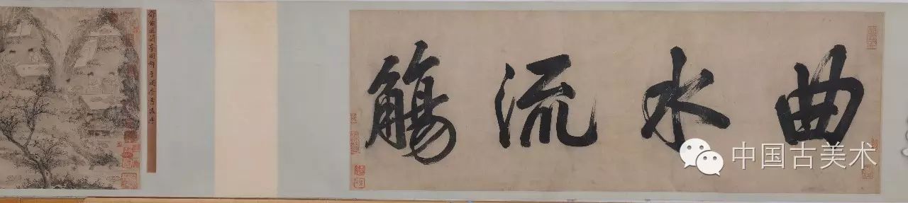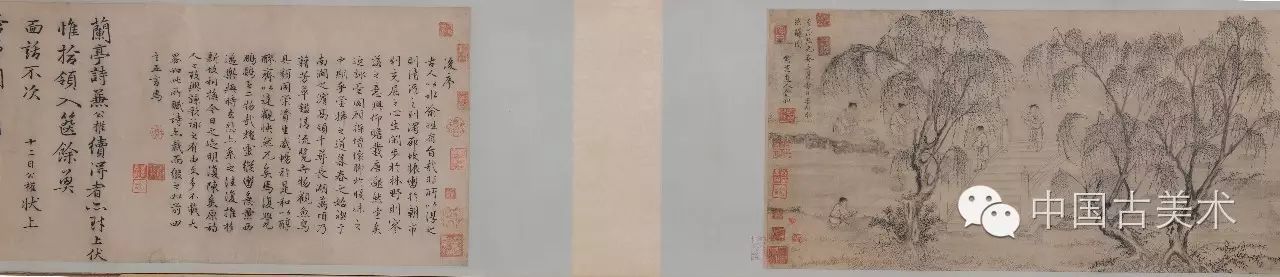 此图为南宋作品,全长 141.1厘米,宽37厘米。引首为元代著名书画家赵孟頫题写的“曲水流觞”四个字。整幅图卷描绘了东晋时期,以王羲之为首的42位文人雅士,在浙江会稽山阴的兰亭雅集,于溪水边饮酒赋诗、观山赏水的情景。睹画思人,让人很容易想像出当年兰亭集序的盛况。