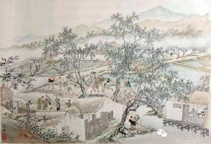 画卷前半部由“腊月浴蚕”到“盐茧瓮藏”,画的是养蚕过程,后半部所画除“蚕蛾出种”和“谢神供丝”两段外,其余七段画的是缫丝织帛的过程。画面前半部注写的比较详细,在画面上难以表现的,如清明日暖种,幼蚕至成蚕每眠所需时间、所应节气、色泽变化,如何切叶喂养,如何拾巧上山等,都配合画面,用小楷标出内容并加注解。后半部所画的纺织过程,包括纺织机具和技术,画的比较详细,但注解比较简单,只有标题而无说明。所绘生缫、络垛、经靷、挽花、做纬等缫丝用具,织帛机具和操作技术,后世虽有改进,其原理相近。特别是“挽花’’一段中的机具,画上的挽花部分所绘提花机,有高起花楼,提花工正在忙于挽提经线,织机中间托有衢盘(目板),下面垂吊衢脚(铅锤),上有两老鸦翅(提刀),并有卷布轴等等。整个结构相当复杂。提花机自商周以来虽有古文献记载,但对花机的机件结构都记录不详,更难得图像记载,我馆《蚕织图》上第一次详细绘出提花机的机体、结构和操作方法,比《天工开物》、《农政全书》所记载提花机早400余年。