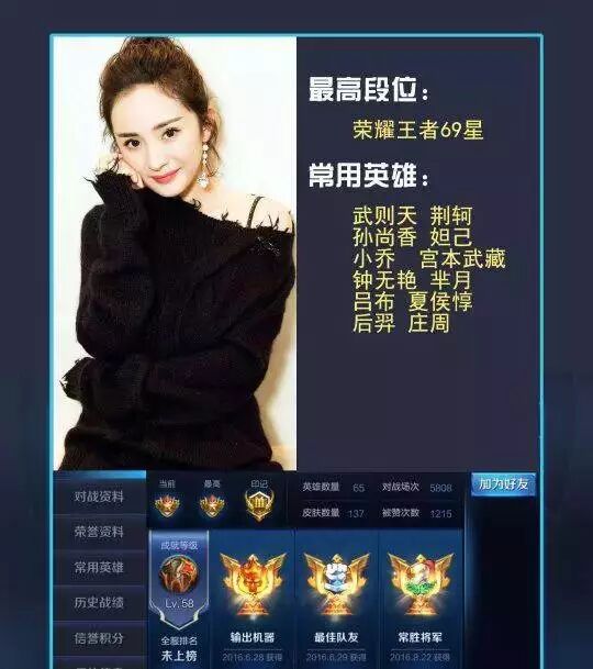 娱乐圈王者排行榜第一名杨幂,最高段位达荣耀王者69星!