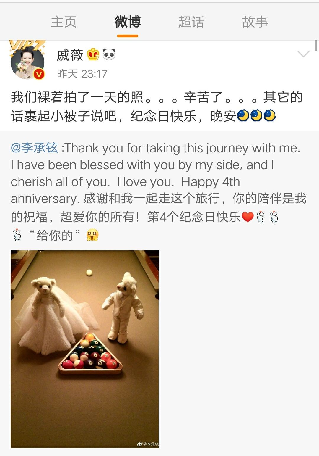 9月8日是戚薇李承铉结婚四周年的纪念日,夫妻俩也在深夜互相发文表白对方,李承铉先是发文表示“感谢和我一起走这个旅行,你的陪伴是我的祝福,超爱你的所有!第四个纪念日快乐 ”最后还配上小lucky的专属biubiubiu,随后,戚薇也转发微博并“开起了车”的回复李承铉:“我们裸着拍了一天。。。辛苦了。。。其它话裹起小被子说吧,纪念日快乐,晚安”。