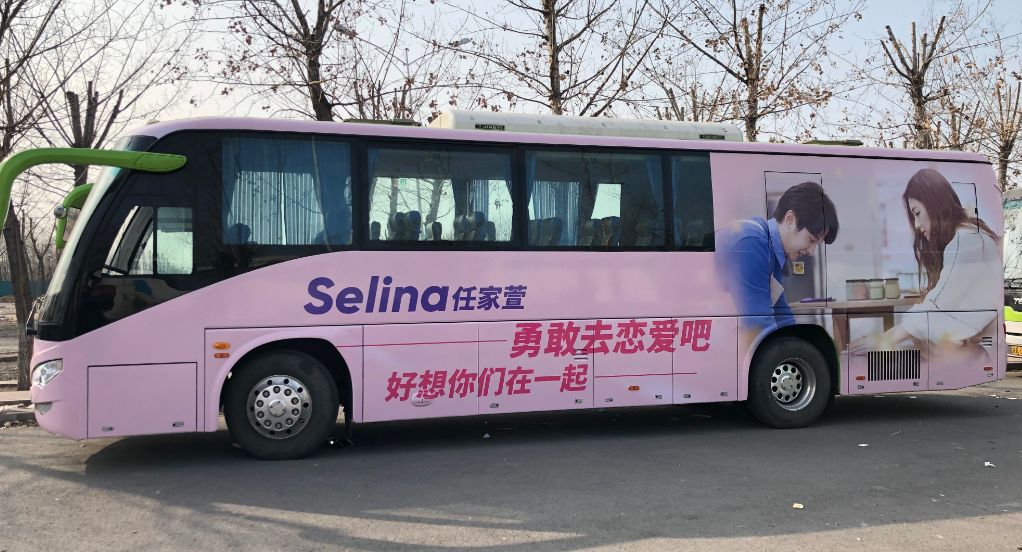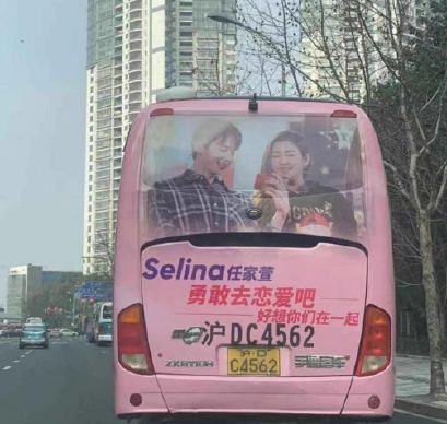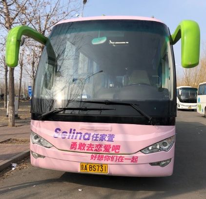 而据说在北京上海,都出现了粉丝包下大巴车,装饰成粉色喊话Selina要勇敢去恋爱,其实,是喊话张轩睿吧