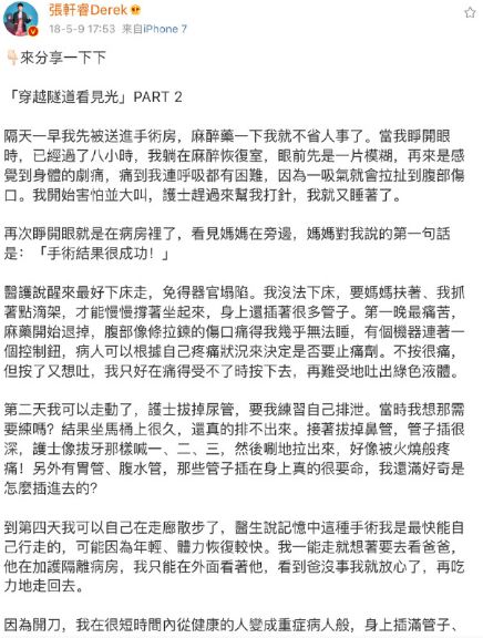 之后张轩睿身材练得不错,但身上还是有十多厘米手术留下的伤疤