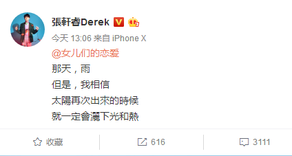 好,回到Selina,这期《女儿的恋爱》播出后,张轩睿在微博留言写道:那天,雨,但是我相信,太阳再次出来的时候,就一定会洒下光和热(他接到奶奶病危的电话,正下大雨),似乎暗藏转机