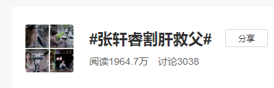 就在昨天, #张轩睿割肝救父# #心疼张轩睿#等话题刷爆了微博,其中#心疼张轩睿#一个话题阅读就近两亿!