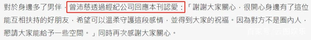为了了解详情,记者特意打电话联系了曾沛慈,她透过经纪公司大方公开恋情,她表示,谢谢大家关心,很开心身边有一位能互相扶持的好朋友,希望能好好守护这段感情,得到大家祝福。