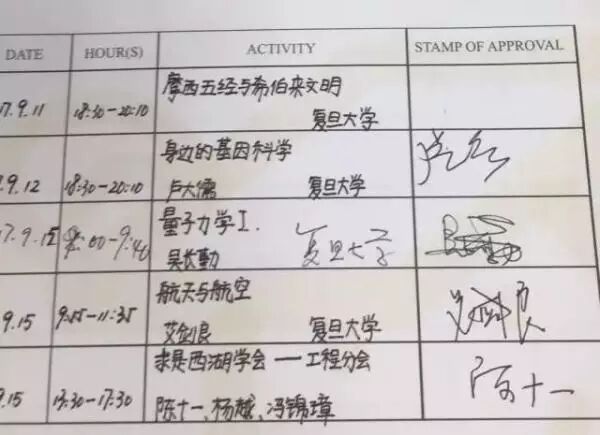 陈明明的小本子上记录着听过的课和授课教师的签名。