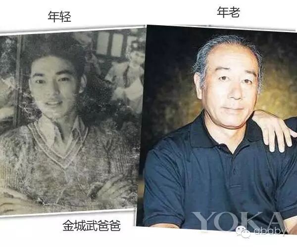 大帅哥金城武和父亲年轻时长得特别像,尤其是两道剑眉、挺拔的鼻梁以及雕刻般的唇线,简直如出一辙。老了后的金爸爸发际线后移,整张脸庞也青春不再。