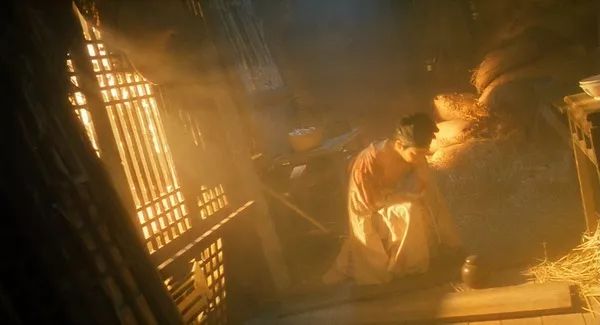 好不容易从阴间救回小倩,天却亮了。他手忙脚乱地,用手顶着倒塌的门窗,用身体挡住阳光,背对着小倩一边落泪,一边催促她进入骨灰坛中。