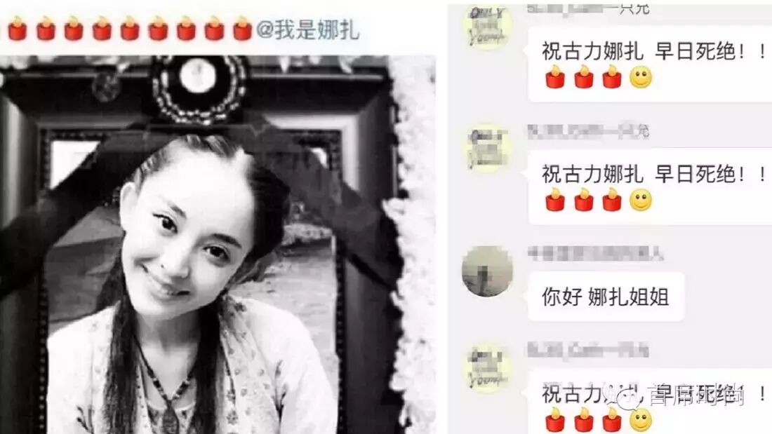 近日,娜扎剧照被P成遗像,其姐姐也被黑粉骚扰,连带妈妈都被诅咒。