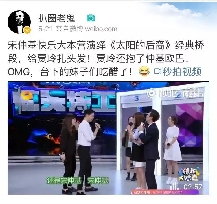 整期节目的高潮是贾玲与宋仲基的互动,贾玲出场之后便对宋仲基展开猛烈攻势,深情告白:欧巴,哦多克,屋里心脏,扑通扑通的!把欧巴吓得躲到角落里去了。接下来两人重现经典扎头发桥段,一开始宋仲基靠近贾玲,她是拒绝的。当欧巴问她是不是没洗头,她回答“也就两个多月吧。”把逗比属性发挥得淋漓尽致,宋仲基因此狂笑不止。