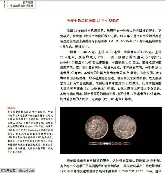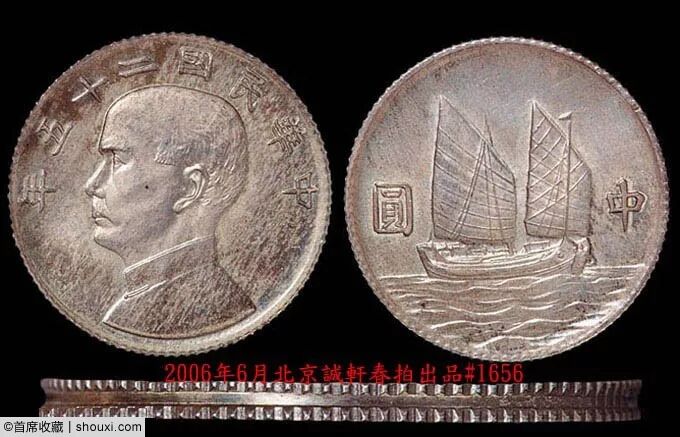 2006年6月北京诚轩春拍出品#1656之民国二十五年帆船安全齿边银币,成交总价人民币22万元。目前仅知存世二枚,这枚原先是由英国收藏家W. von Halle所有,出现在1966年11月伦敦Glendining公司举行的拍卖会,后落入美国藏家古德曼之箧,1991年6月加州拍卖会以美金1,980元售出,同场另一枚的成交价则是1,540元。过去的图录上均无带凹槽齿边的照片,仅以文字叙述常使人不明其所以然而被忽略,此附加的特写图,补充了记载之不足也。