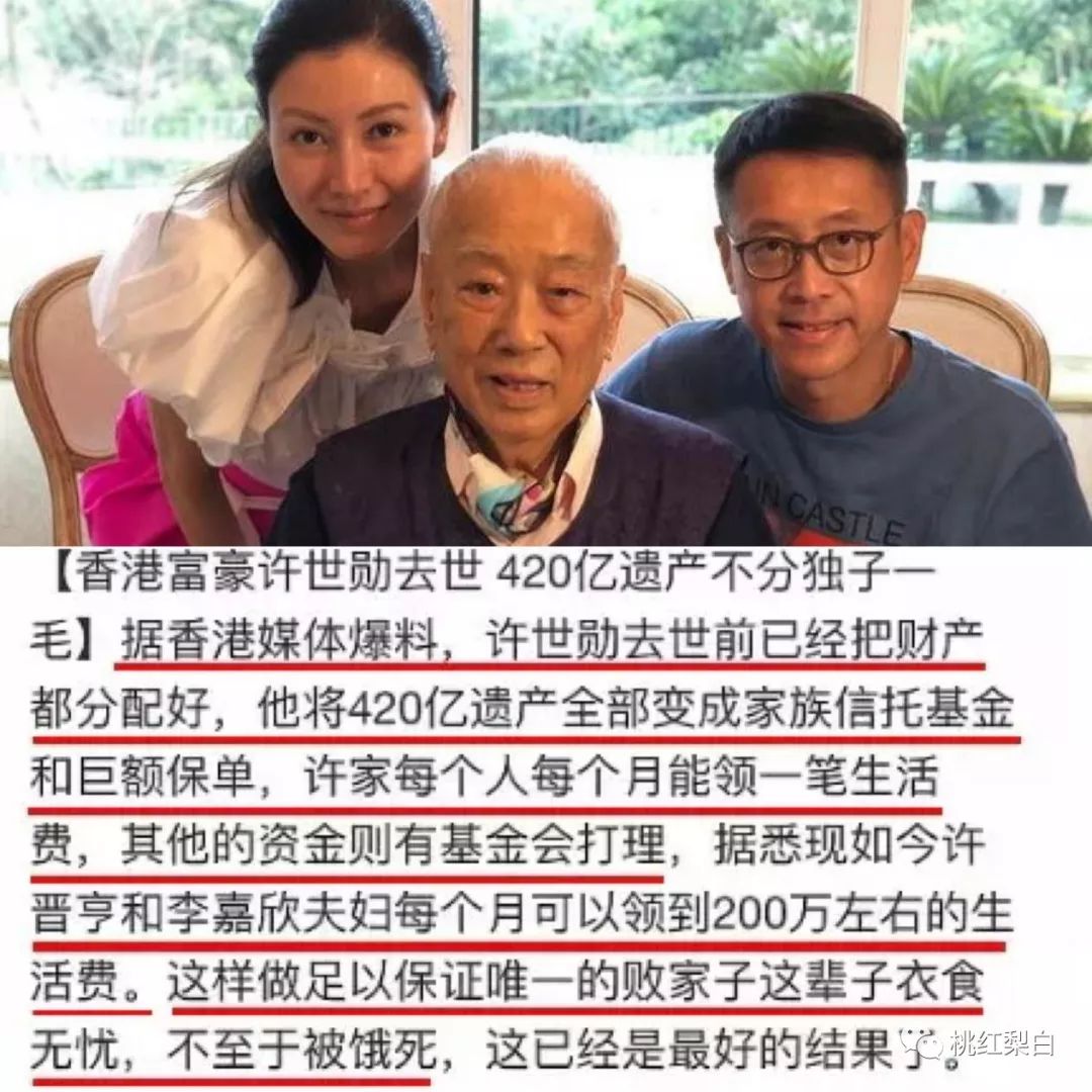 再往前,是李嘉欣被曝公公许世勋去世后,每个月只能从许家支付200万的生活费。