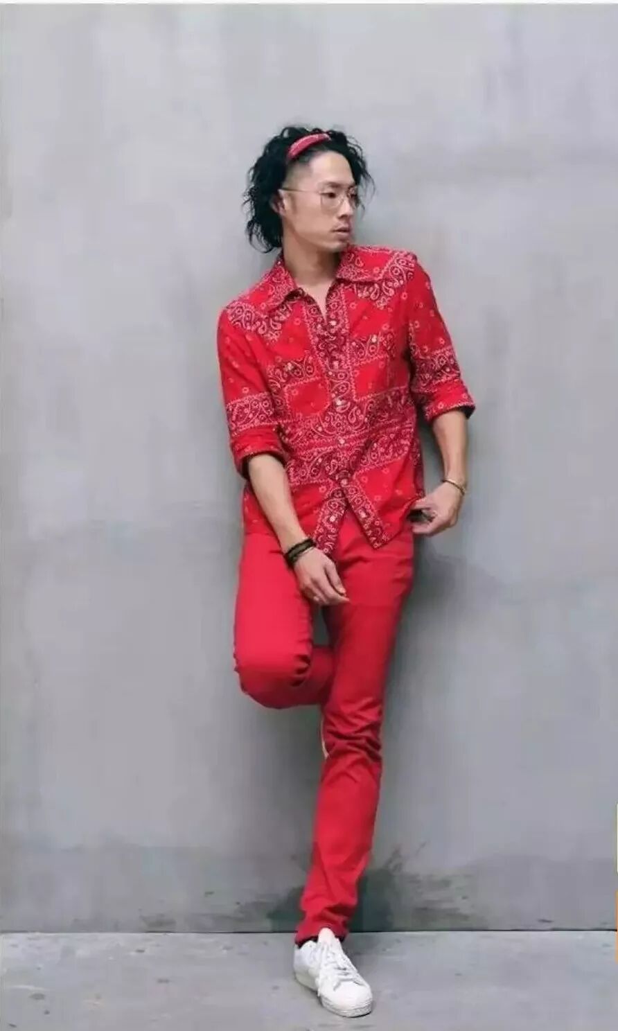 看这骚气的腰果花红头巾,红衬衫,红裤子!