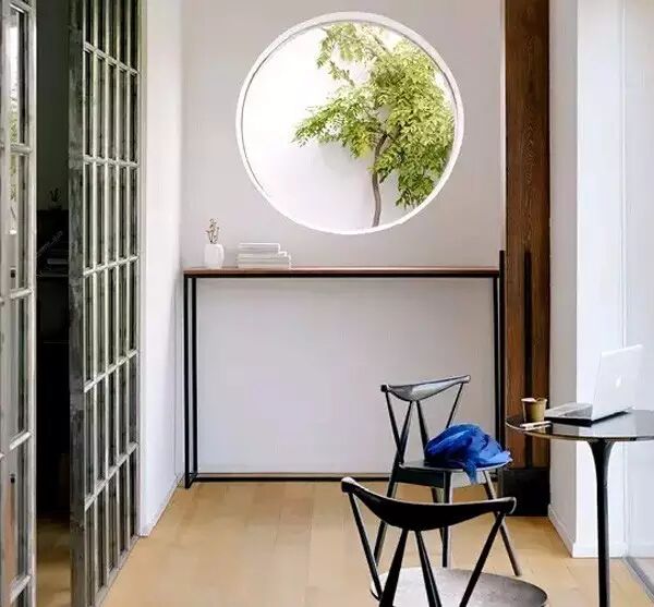 周围环境与工作空间相互融合,甚至树木都可以贯穿其中,处处透露着一股禅意,特别是走廊的设计,引入江南园林式的建设风格,圆窗与绿植的交相呼应让空间更显惬意。