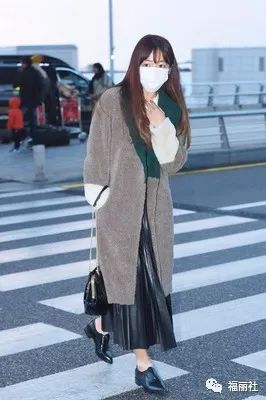 A Pink组合成员孙娜恩用白色大衣搭灰色纱质长裙,看起来十分雅致;同一组合的金南珠则用撞色款毛绒外套搭配黑色百褶裙。