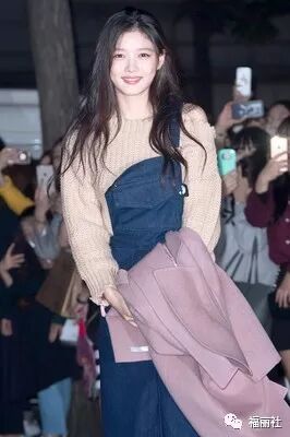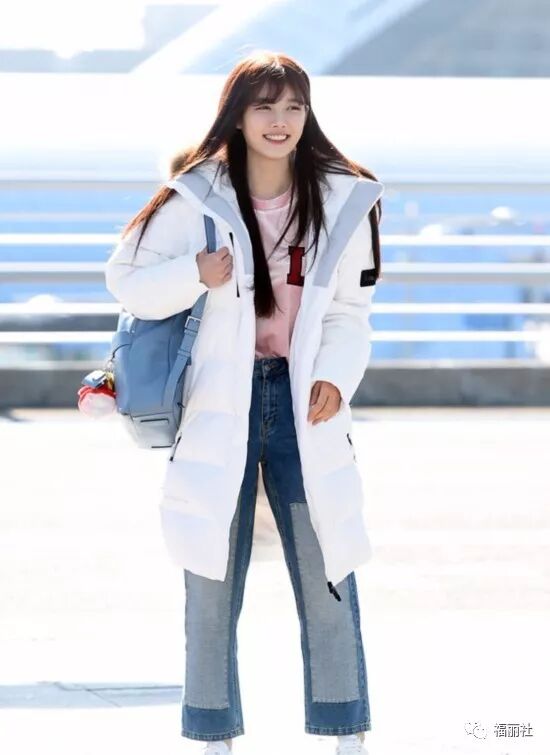 金裕贞把粉色卫衣穿在羽绒服中,完全让人忽视臃肿与否的问题,而且这姑娘真的很会穿粉色,粉色毛呢外套搭配牛仔背带裙,时刻洋溢着青春的气息!