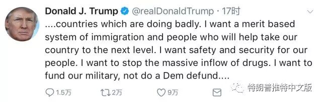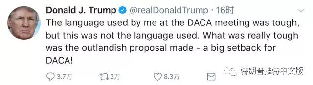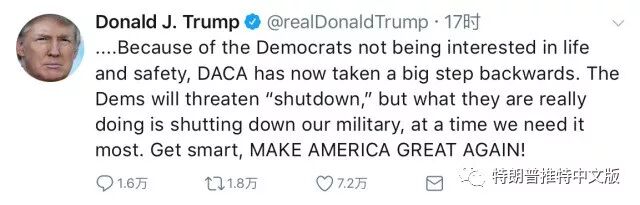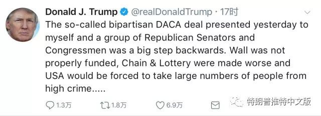 昨天,所谓的两党合作DACA协议对我和一群共和党参议员和国会议员是一个巨大的倒退。墙没有得到适当的资助,连锁移民和乐透绿卡的情况变得更糟,美国将被迫大量从高犯罪率国家中获取大量的人口。我希望建立一个基于价值的移民体系,并帮助我们的国家进入下一个阶段。我希望我们的人民得到安全和保障。我想阻止大量的毒品流入。我想为我们的军队提供资金,而不是因为民主党人对生活和安全不感兴趣而为民主党撤资,DACA现在已经后退了一大步。民主党将威胁到“政府关门”,但他们真正在做的是关闭我们的军队,在我们最需要的时候。变得聪明,让美国重新变大!