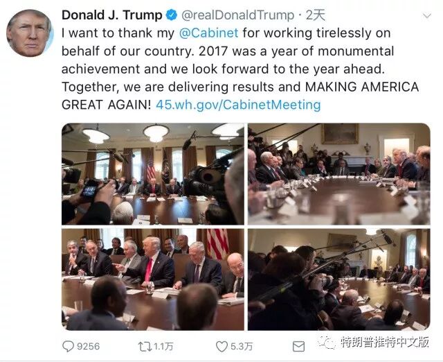 我要感谢我的@Cabinet,为我们的国家不知疲倦地工作。2017年是我们取得巨大成就的一年,我们同时也期待着这一年。我们共同努力,让美国再次成为伟大的国家!