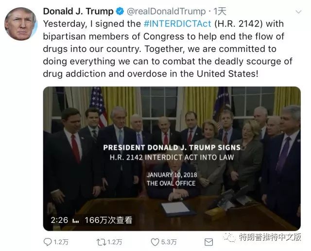 昨天,我与国会两党议员签署了《第2142号法案》,以帮助结束毒品流入我们的国家。我们将共同努力,竭尽所能地打击美国毒品成瘾和过量吸食的致命祸害!
