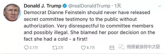 卑鄙的Dianne Feinstein在许多场合都表示发现在特朗普/俄罗斯之间的勾结还未被发现,他会以这样一种卑鄙的、甚至是非法的方式释放证词,这完全是一种耻辱。肯定有强硬的靠山!