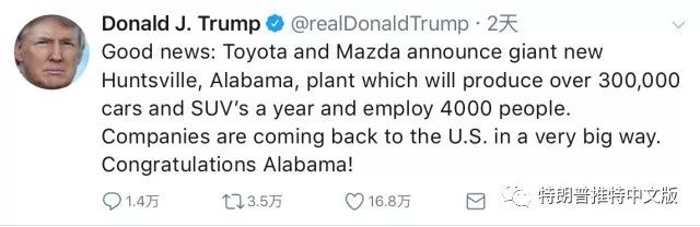 好消息是,丰田和马自达宣布,阿拉巴马州的新亨茨维尔,将生产超过30万辆车和SUV,并雇佣4000名员工。公司正以一种非常大的方式回到美国。恭喜阿拉巴马州!