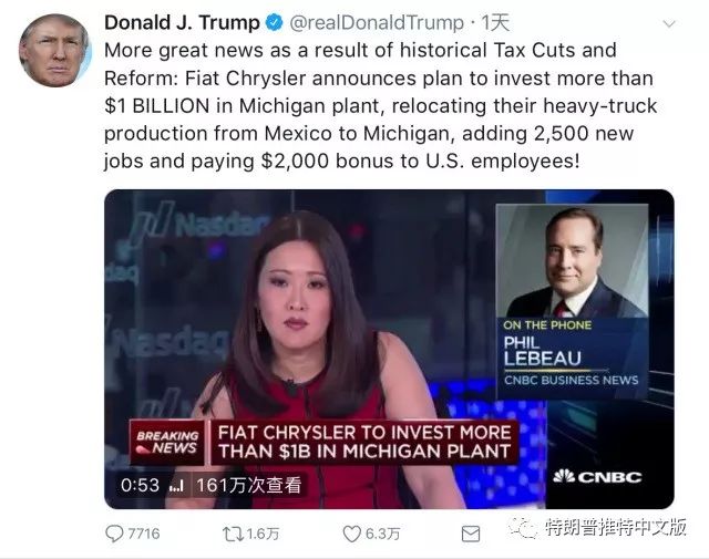 更大的好消息是历史减税和改革的结果,菲亚特·克莱斯勒宣布将在密歇根的工厂投资超过10亿美元,将他们的重型卡车从墨西哥转移到密歇根,增加2500个新工作,给美国员工提供2000美元的奖金!