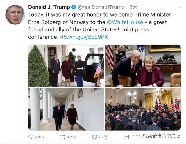 今天,我非常荣幸地欢迎挪威首相厄纳·索尔伯格(Erna Solberg)来到@白宫——美国的好朋友和盟友!