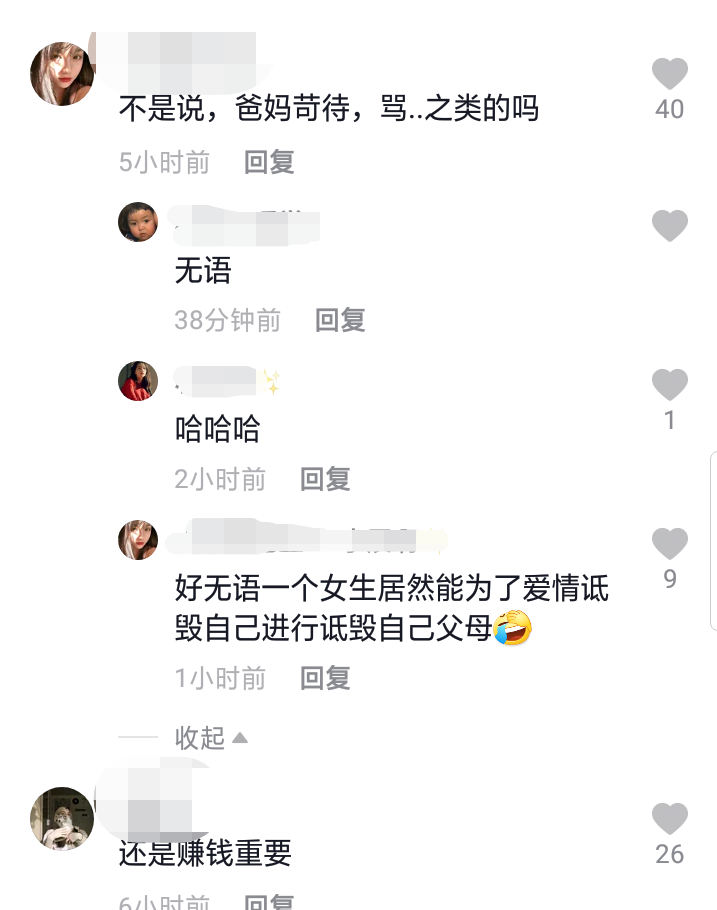 网友在评论区diss她:“如何做到若无其事呢”、“还是赚钱重要”、“不是说,爸妈苛待,骂之类的吗”。