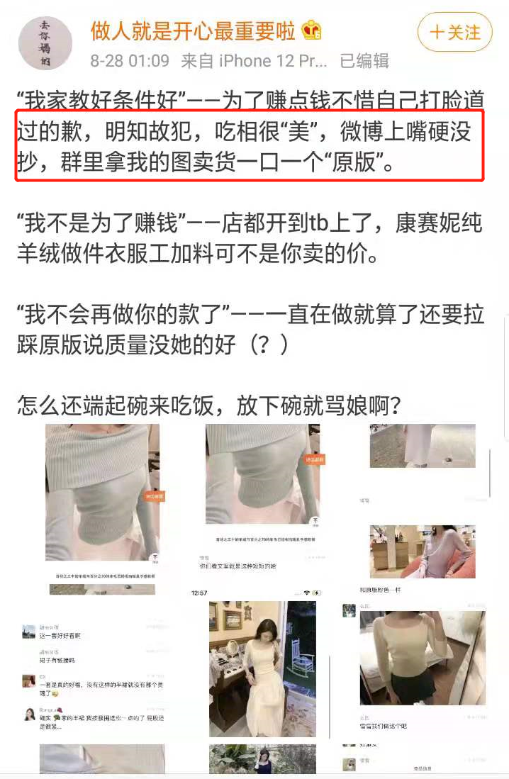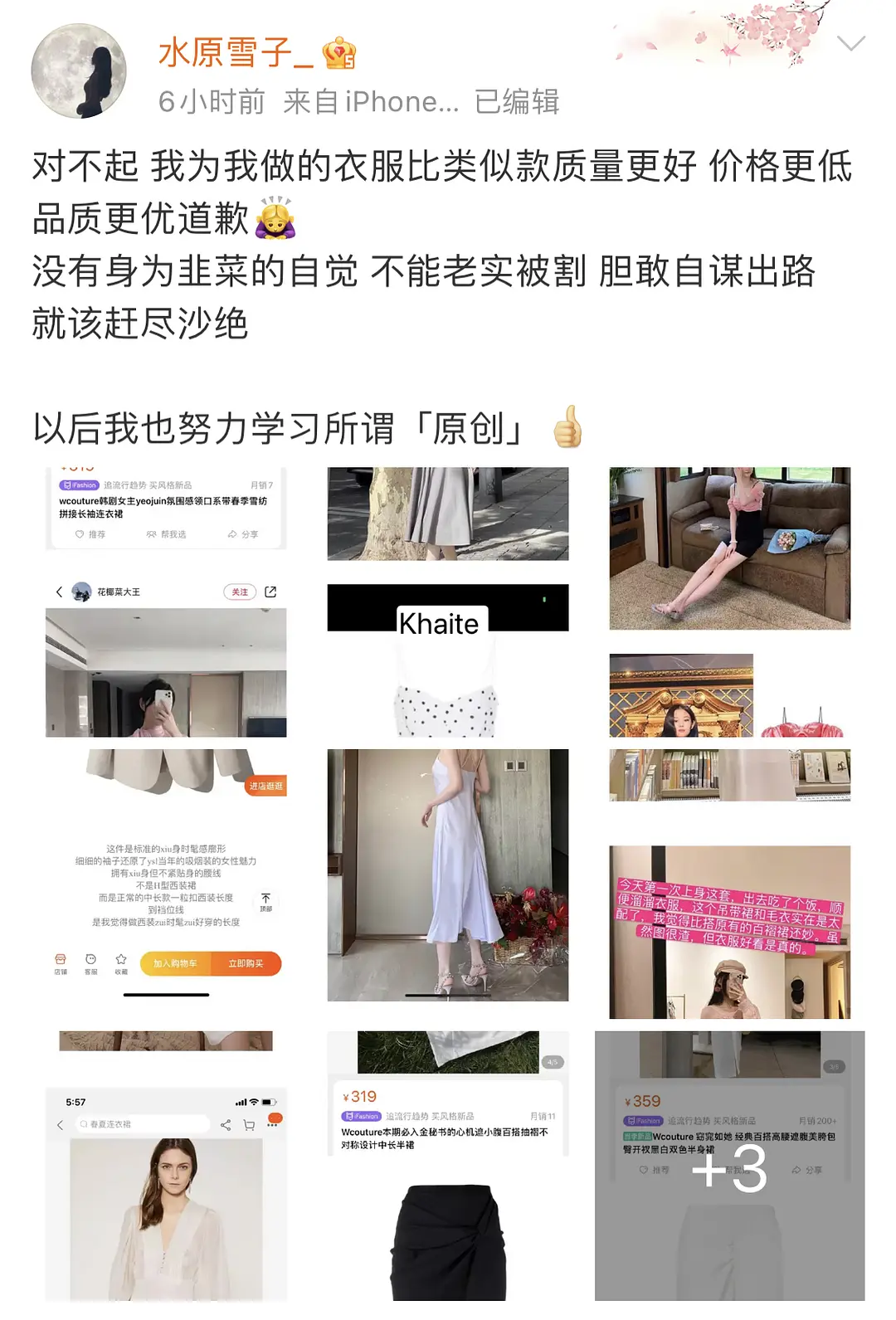 现在水原雪子发微博道歉,说我为我做的衣服比类似款质量更好,价格更低品质更优道歉,以后我也努力学习所谓的原创。