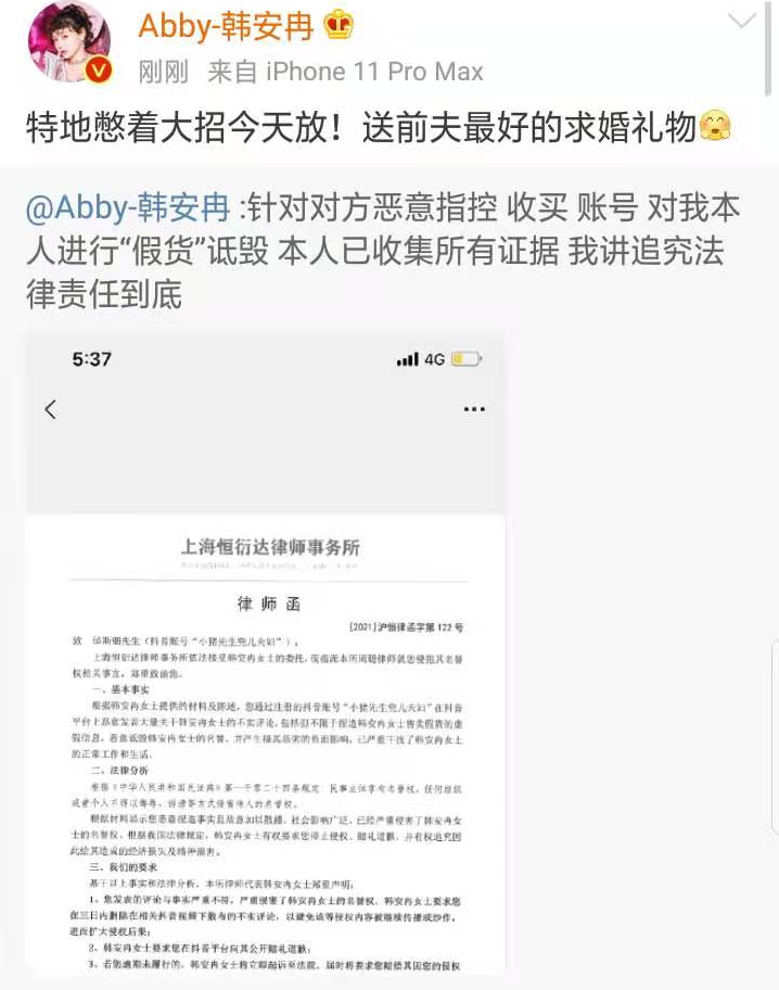 韩安冉还特意跳求婚日子发律师函,真的是太笋了。